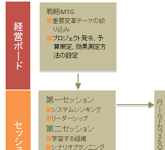 このプログラムでは、組織において重要な変革テーマを複数設定し、次世代経営者候補者をそのテーマのプロジェクトリーダーとすることからスタートします。
